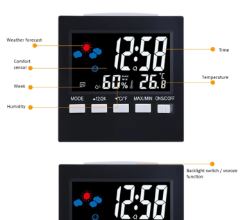 - ปฏิทินและฟังก์ชั่นนาฬิกา - แสดงอุณหภูมิได้ทั้งในรูปแบบฟาเรนไฮต์และเซลเซียส- สามไอคอนสำหรับตัวบ่งชี้ระดับความสะดวกสบายของสภาพอากาศในร่ม