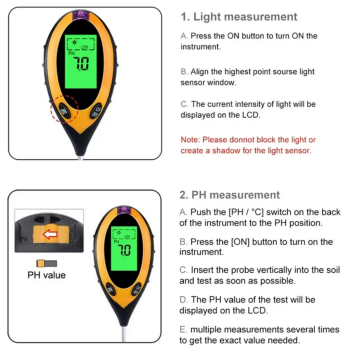 ใช้งานง่าย: ใช้งานง่ายและแสดงพารามิเตอร์บนหน้าจอขนาดใหญ่, กระชับและใช้งานง่าย ประหยัดพลังงาน: เครื่องมือนี้มีไฟแสดงสถานะต่ำและฟังก์ชั่นปิดเครื่องอัตโนมัติ ประหยัดเวลาและความพยายามและประสิทธิภาพ วิทยาศาสตร์และถูกต้อง: อ่านน้ำ PH และความสว่างได้ง่ายและถูกต้องเพื่อส่งเสริมพืชที่มีสุขภาพดีหลากหลายของการใช้งาน: เหมาะและจำเป็นเครื่องมือสำหรับชาวสวน,ในร่มและกลางแจ้งพืช,สวนและสนามหญ้า โครงการนี้เป็นเครื่องมือที่สมบูรณ์แบบสำหรับการทดสอบสภาพดินเช่นผลไม้ดอกไม้ผักและพุ่มไม้