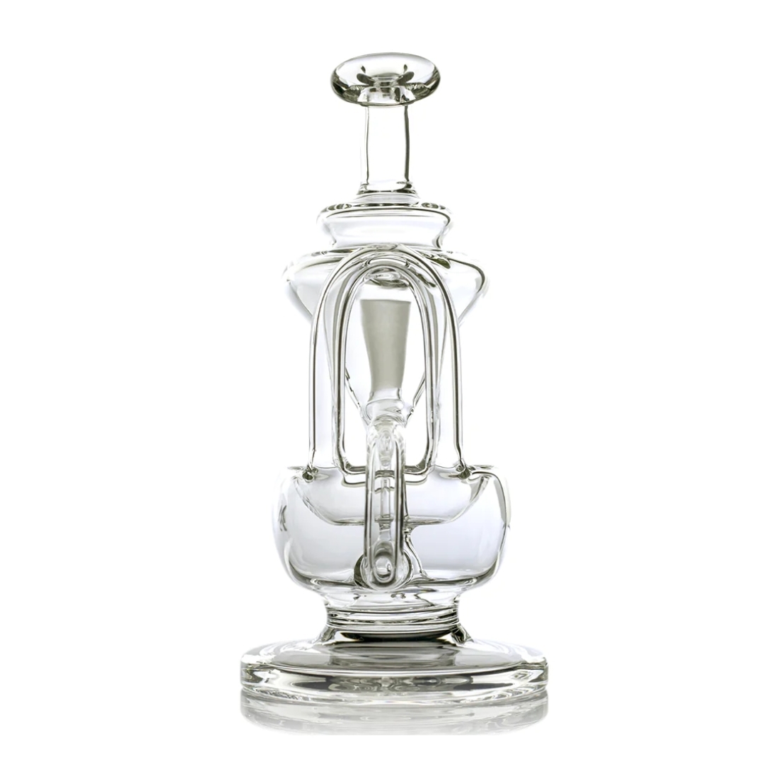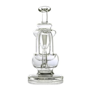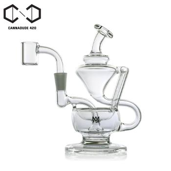 Building on MJ Arsenal's classic recycler rig design, they have added aesthetic aqueducts that guide water into two clear turbines. These turbines cool the vapor with each inhale, delivering a perfect flavor profile with every pull. The Claude Mini Rig, a unique double uptake recycler rig, has protruding arms and an asymmetrical look that adds a touch of elegance to your collection and boosts the rig's performance.