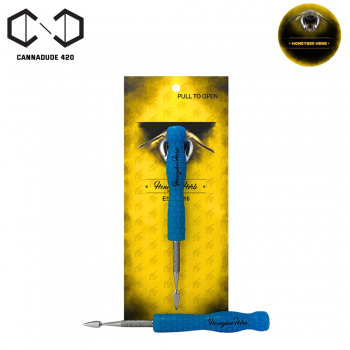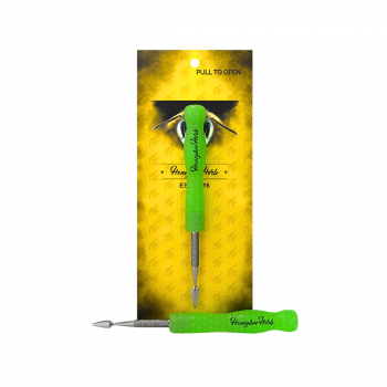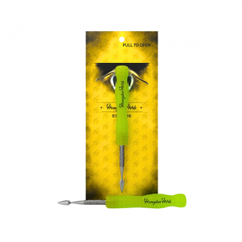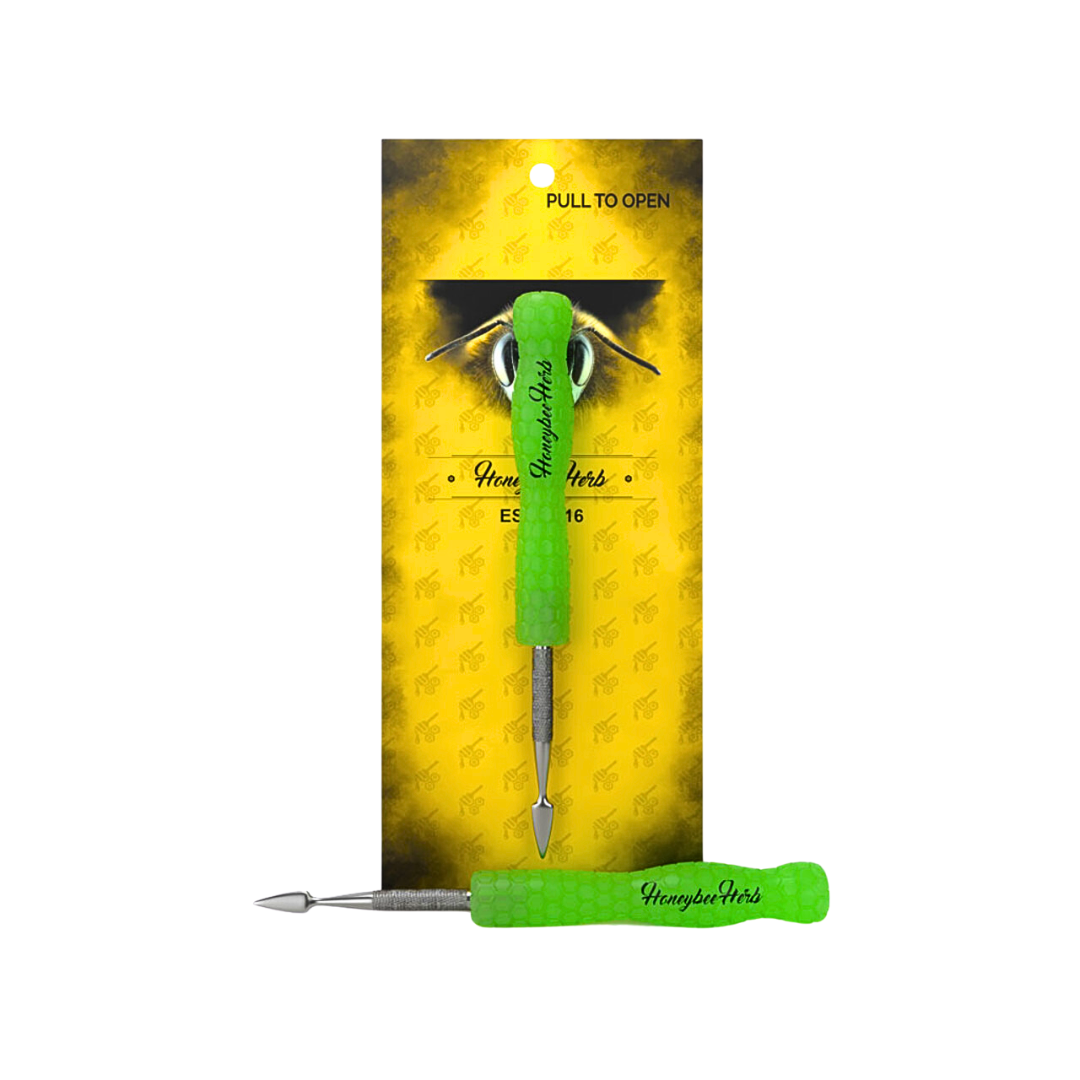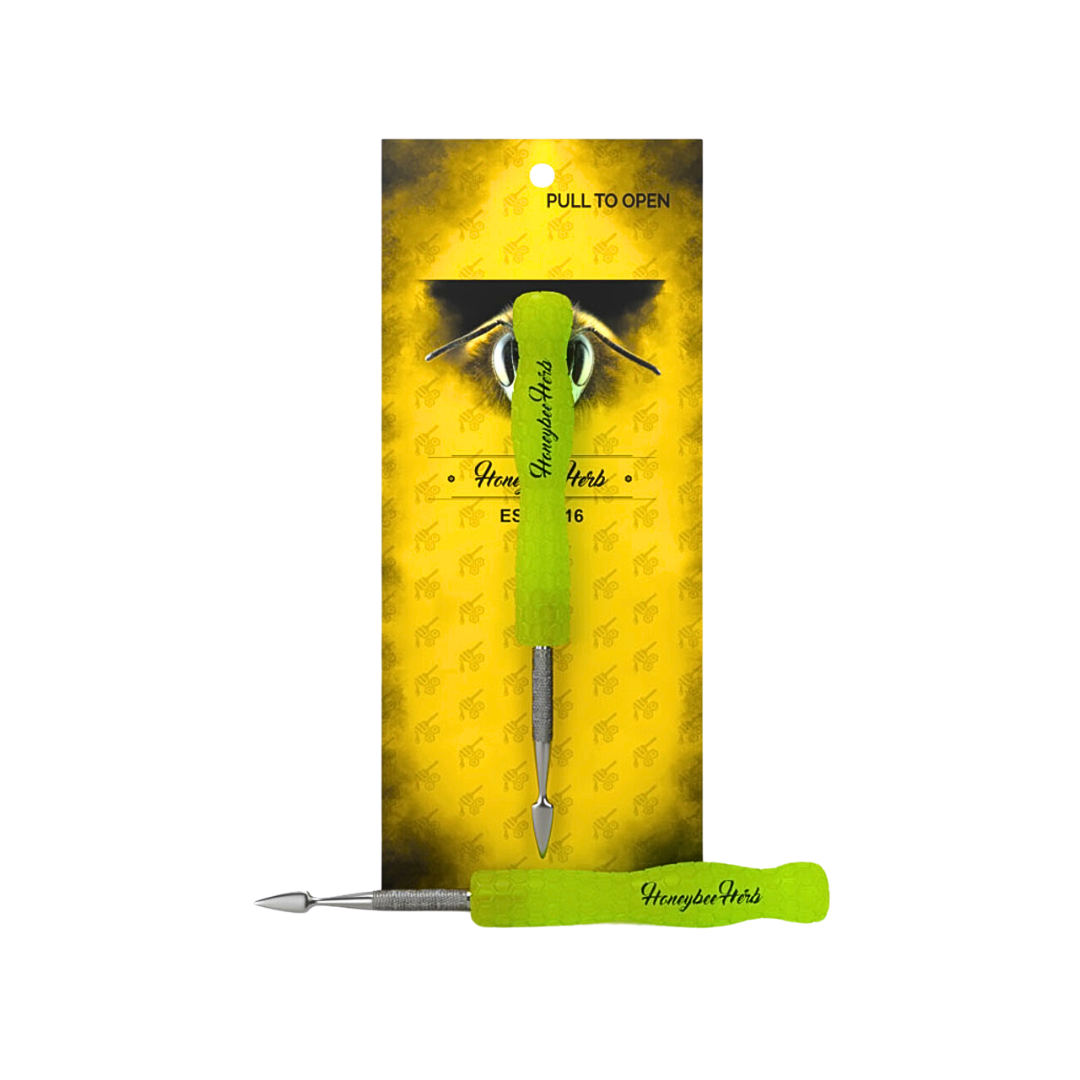 The spearhead/spade-style tip is used in the Glow In Dark Dab Tool for scooping and slicing up your concentrates with ease. This dabber tool features 3 different color resin handle options, and it is now on the website.