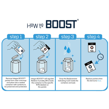 เทคโนโลยีควบคุมความชื้นที่ขายดีที่สุดจากสหรัฐอเมริกา บอกลาความชื้นและแห้งเกินไป ใช้ชุดควบคุมความชื้น Integra Boost 2-way เพื่อควบคุมความชื้นในพื้นที่ปิด เทคโนโลยีของเราจะปล่อยหรือดูดซึมความชื้น โดยคงความชื้นสัมพัทธ์ไว้ที่ 62% และยังมีการ์ดที่ชาญฉลาดและอ่านง่ายไว้ในชุด Integra Boost ด้วย เพียงเปลี่ยนชุดใหม่ เมื่อจุดสีแดงบนการ์ดเปลี่ยนเป็นสีน้ำเงิน