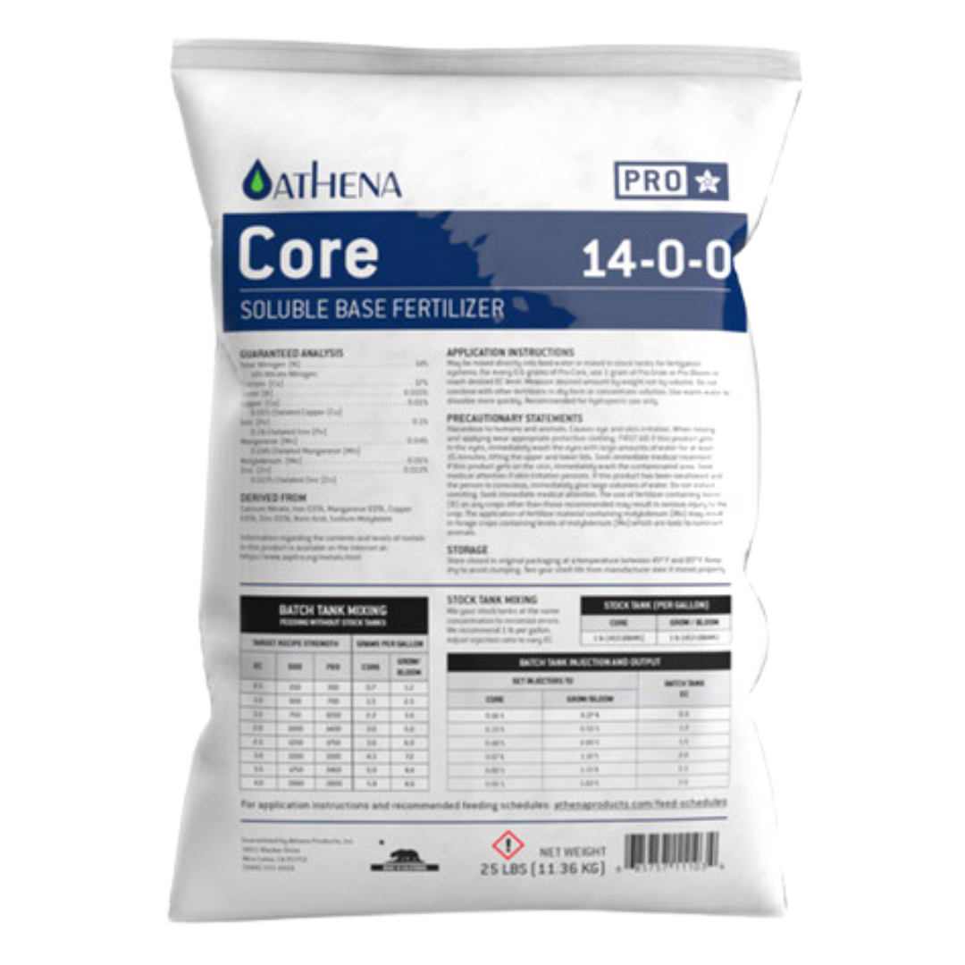 Athena Pro Core ให้สารอาหารพื้นฐานที่แข็งแกร่งในทุกขั้นตอนของการเจริญเติบโตของพืช ไนโตรเจนเพื่อประกอบคลอโรฟิลล์และกรดอะมิโน แคลเซียมสร้างโครงสร้าง
