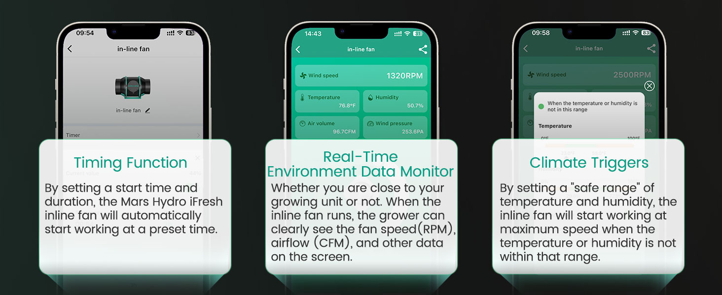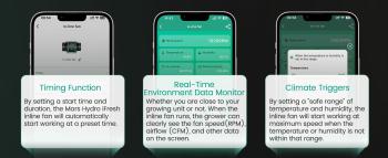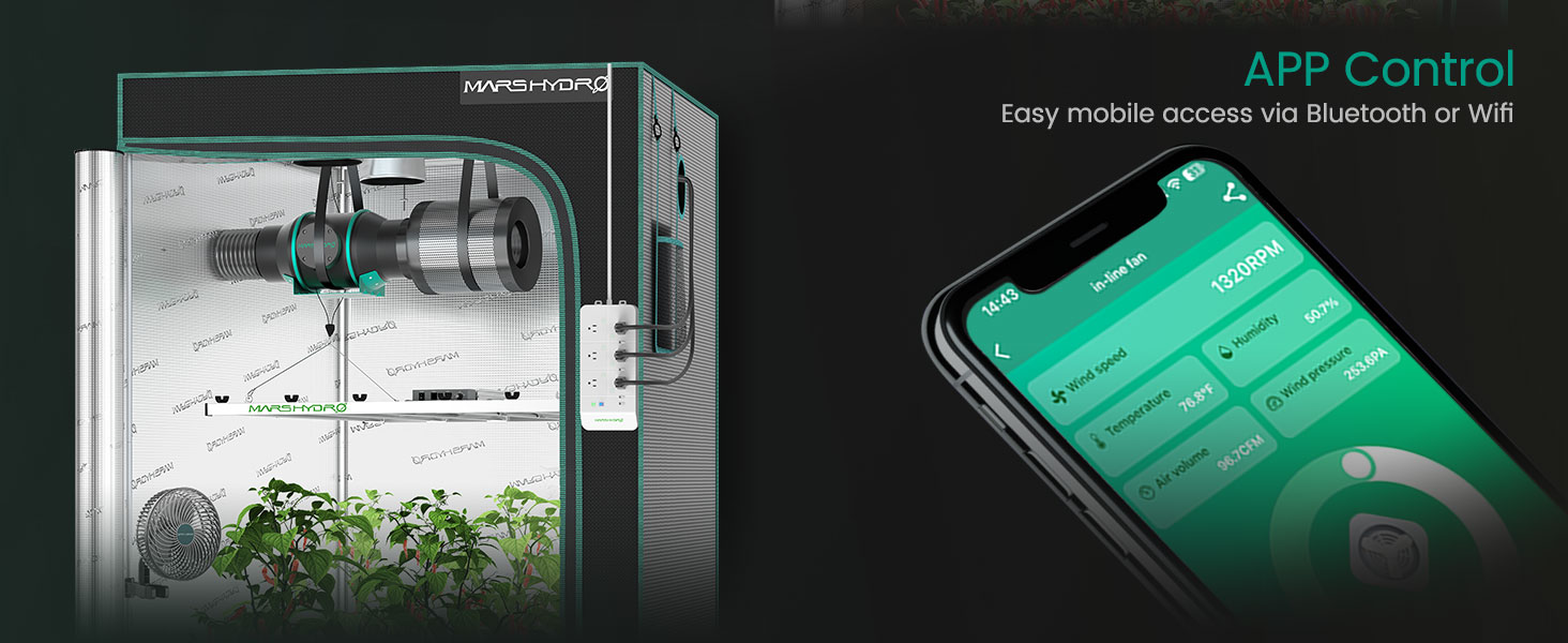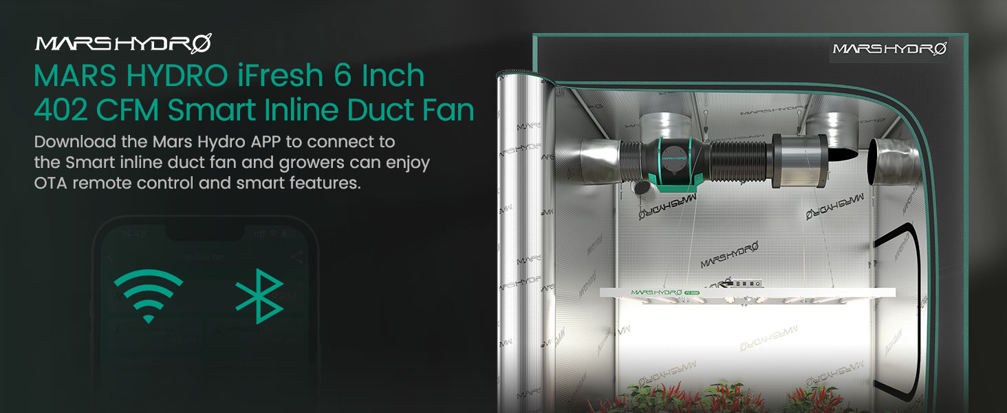 • การระบายอากาศอัจฉริยะสำหรับเต็นท์เติบโต: เมื่อดาวน์โหลดแอป Mars Hydro ผู้ปลูกในร่มสามารถเชื่อมต่อกับพัดลมท่ออินไลน์ขนาด 6 นิ้วของ iFresh และเพลิดเพลินไปกับคุณสมบัติอัจฉริยะ เช่น รีโมทคอนโทรล OTA สัญญาณเตือน ตัวกระตุ้นสภาพอากาศ และตัวจับเวลาแบบวนซ้ำ ซึ่งทั้งหมดนี้สามารถเข้าถึงได้ด้วยการคลิกเพียงไม่กี่ครั้ง บนสมาร์ทโฟนของพวกเขา นอกจากนี้ยังสามารถควบคุมความเร็วพัดลมและฟังก์ชั่นเปิด/ปิดได้ด้วยปลายนิ้วสัมผัส (อย่างไรก็ตาม ผู้ปลูกสามารถใช้ตัวควบคุมความเร็วที่มาพร้อมกับพัดลมเพื่อควบคุมได้เช่นกัน)