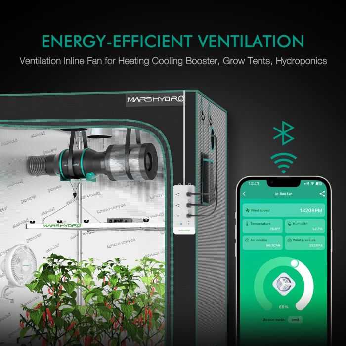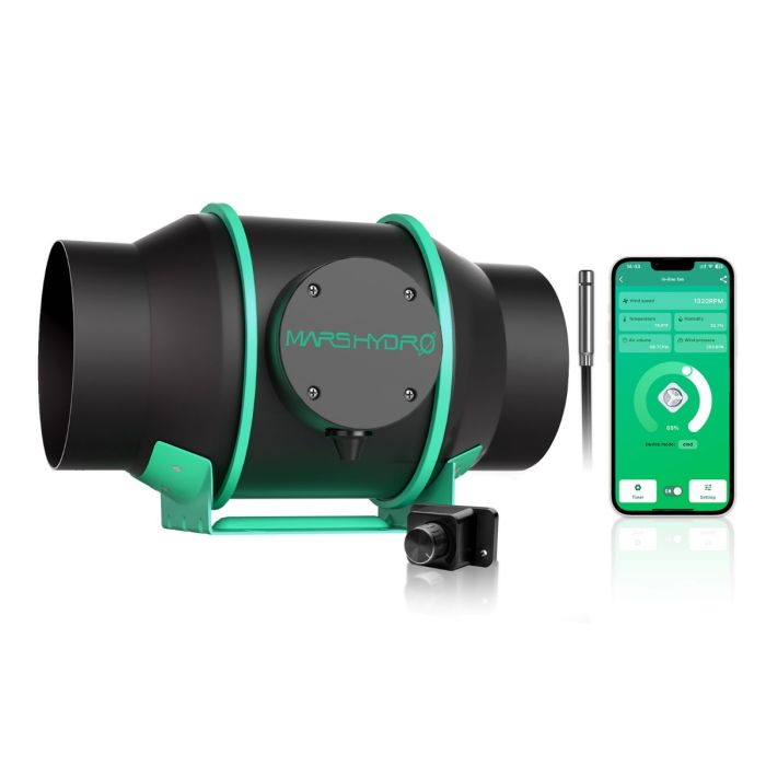 ชุดระบายอากาศอัจฉริยะ Mars Hydro 6” มีพัดลมท่อแบบอินไลน์ขนาด 6 นิ้วที่ควบคุมโดย APP และตัวกรองถ่านที่มีประสิทธิภาพสูง มอบระบบทำความเย็นและการกรองอัจฉริยะสำหรับเต็นท์ปลูกของคุณเพื่อควบคุมและทำให้อากาศบริสุทธิ์และอากาศบริสุทธิ์ ในห้องปลูกของคุณ