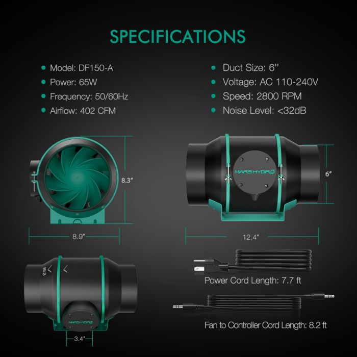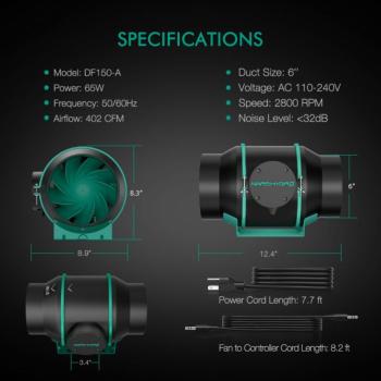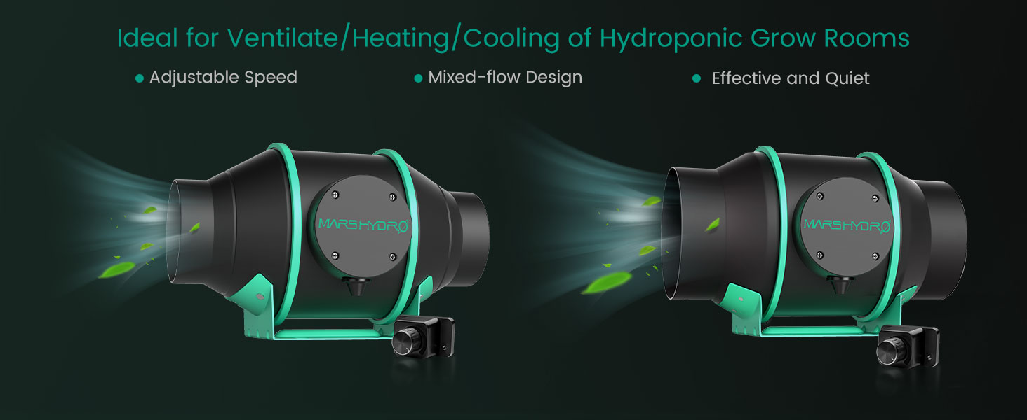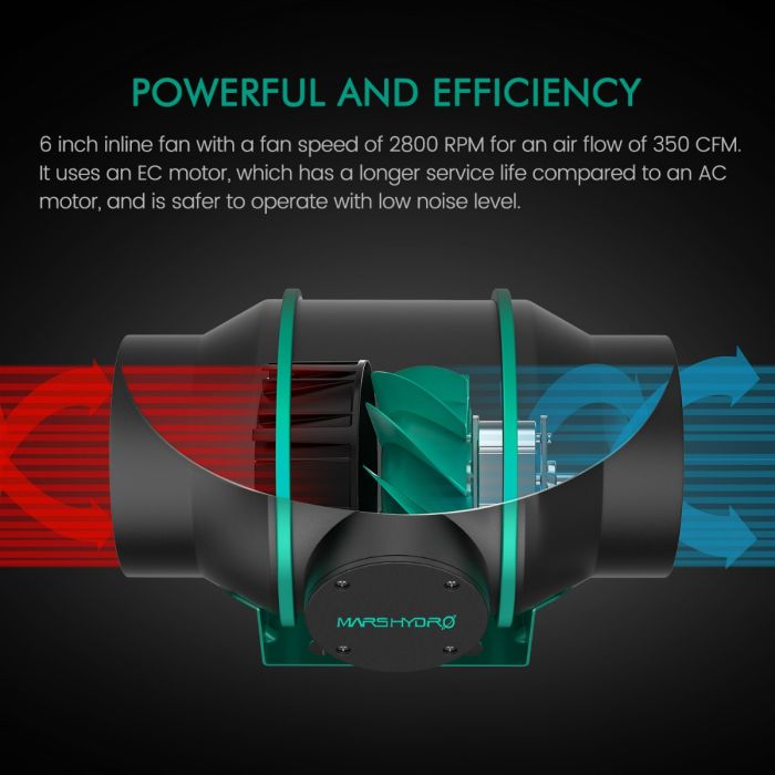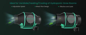 • พัดลมอินไลน์ที่ทรงพลังและเงียบ: พัดลมอินไลน์ Mars Hydro iFresh ขนาด 6 นิ้ว โดดเด่นด้วยมอเตอร์ EC ที่ควบคุมด้วย PWM และการออกแบบการไหลแบบผสม ซึ่งช่วยให้สามารถไหลเวียนของอากาศได้มากถึง 402 CFM โดยมีเสียงรบกวนต่ำ ทำให้สามารถระบายอากาศและระบายความร้อนให้กับเต็นท์ขนาด 4×4 ฟุต และ 5×5 ฟุต
