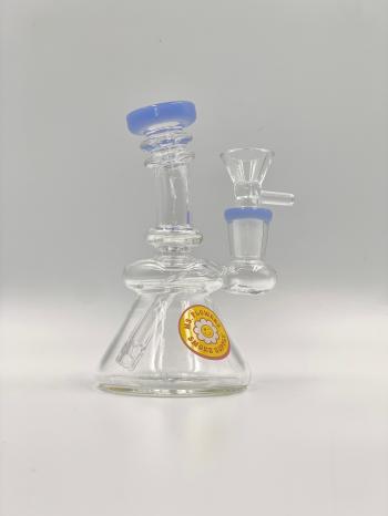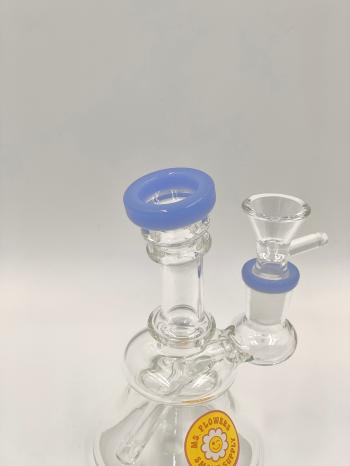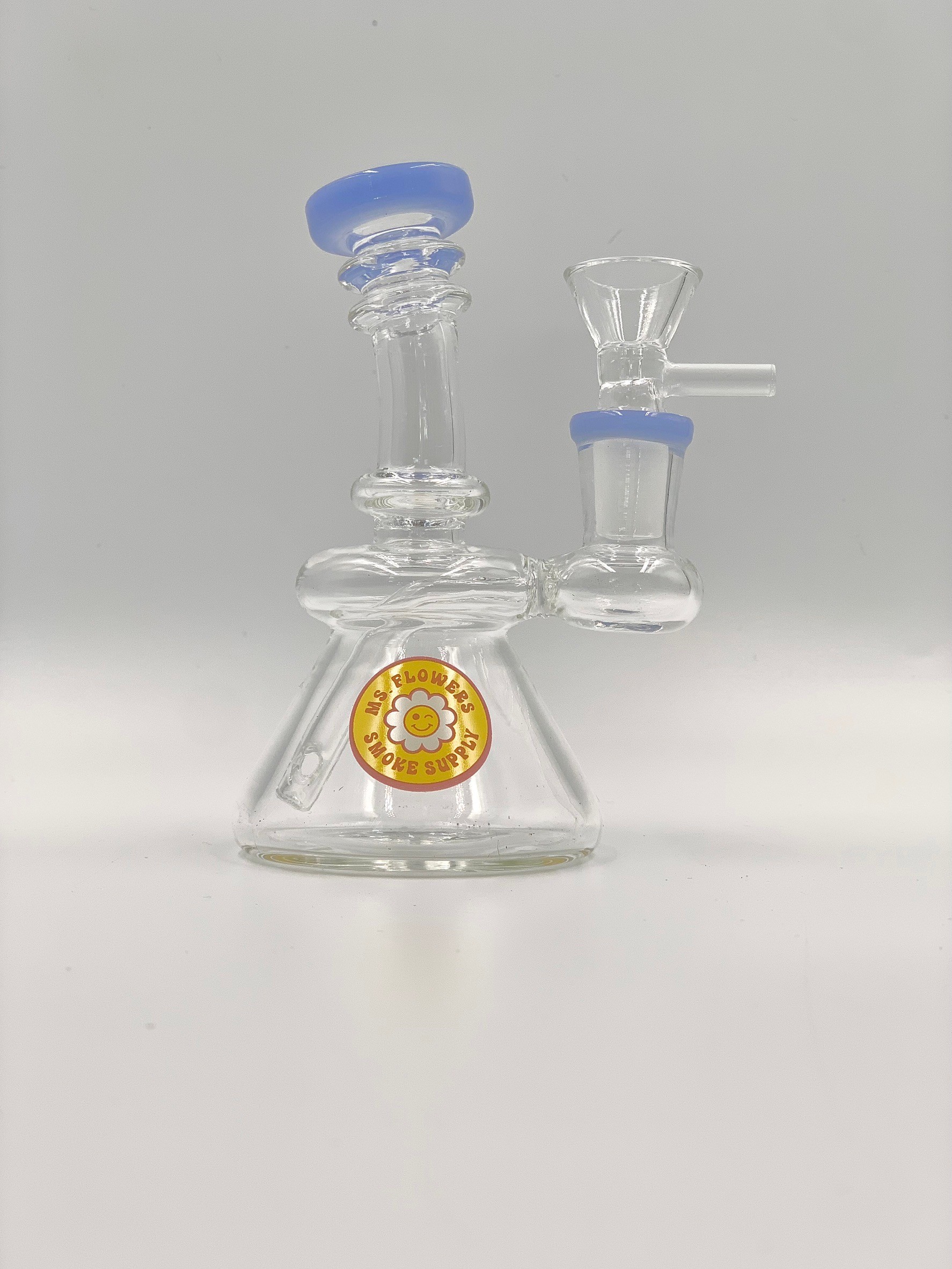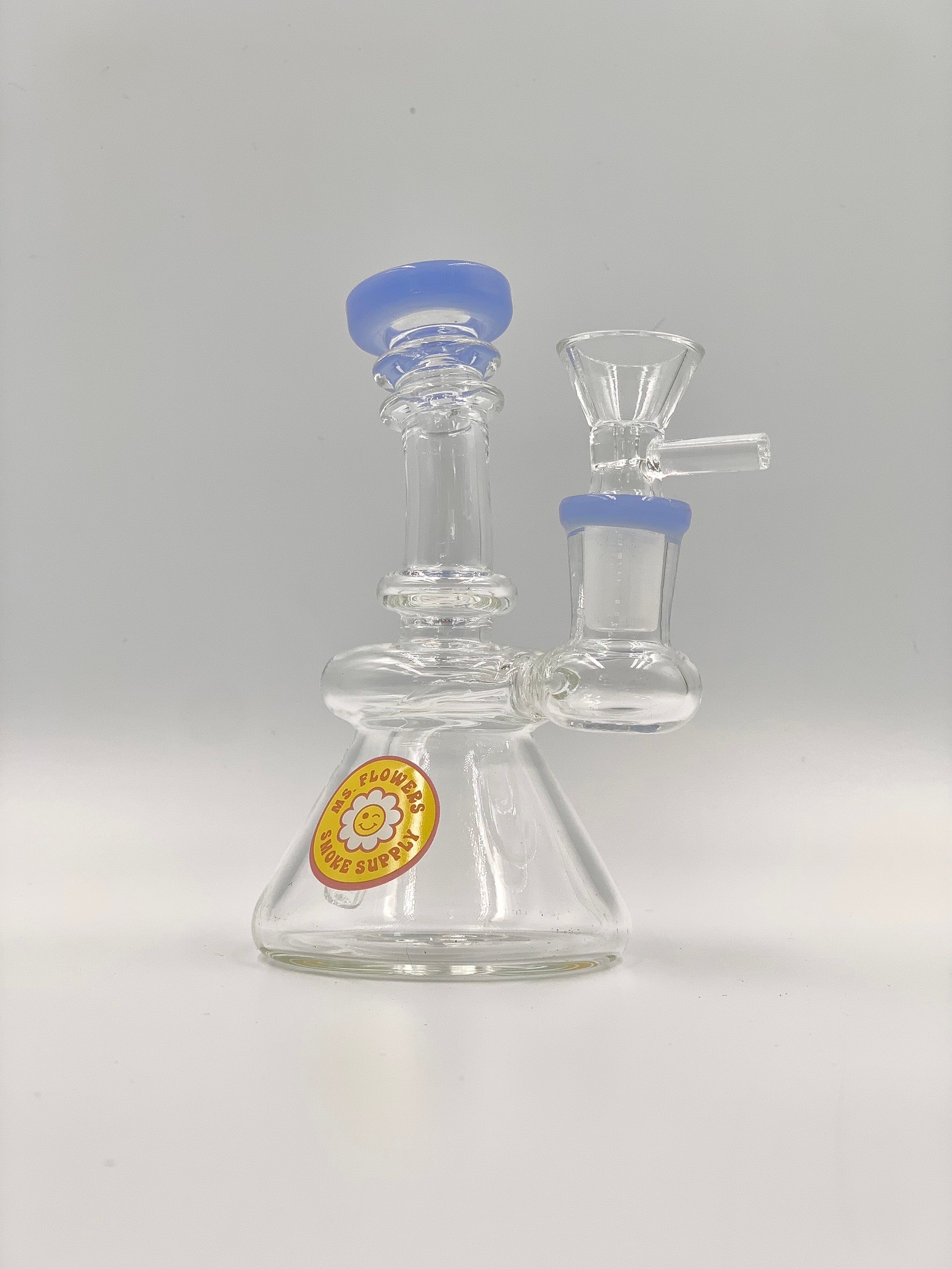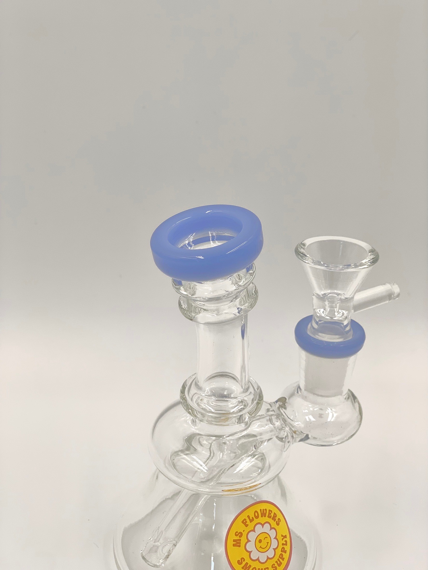 The Ms. Flowers® Mini Bong is 5" tall and made from premium borosilicate glass with added colored accents. The multi-hole percolation is fixed to the rig so making this a super portable piece. The bent-neck and flared mouthpiece help to provide splash-free hits while smoking. The Mini Bong comes with a matching 14mm bowl and a wide base for added stability while not in use.