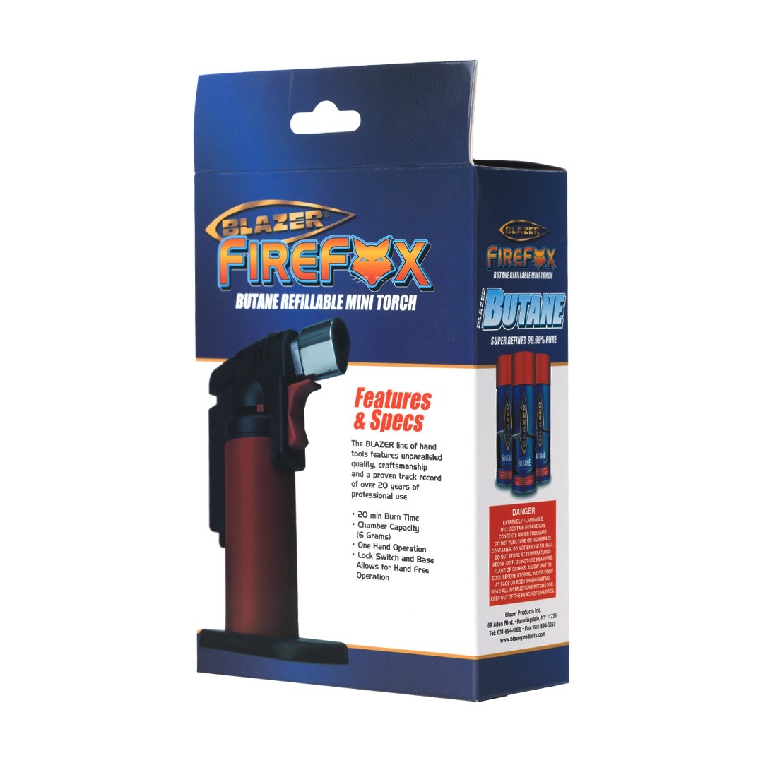 Introducing the New Blazer Firefox 2.0. The same great Mini Torch is now with a Dual Flame feature, burn from a powerful butane Blue Flame to a softer and cooler Yellow Flame. Ideal for applications where a softer flame is required.