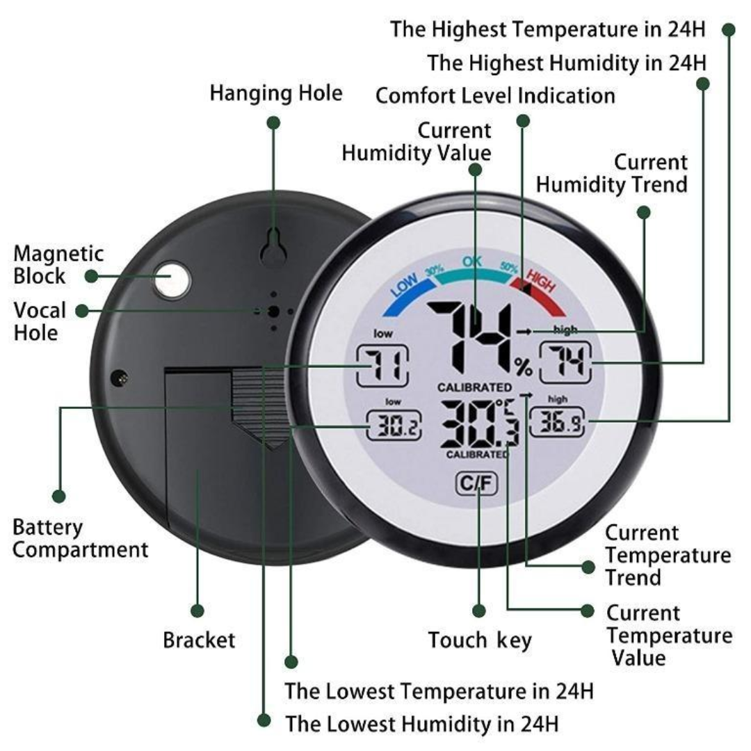 - เครื่องวัดอุณหภูมิแบบดิจิตอล - มีเซนเซอร์สอบเทียบอย่างสมบูรณ์เพื่อวัดความชื้นและอุณหภูมิ - ขนาดเล็กพกพาสะดวกพร้อมจอแสดงผลขนาดใหญ่