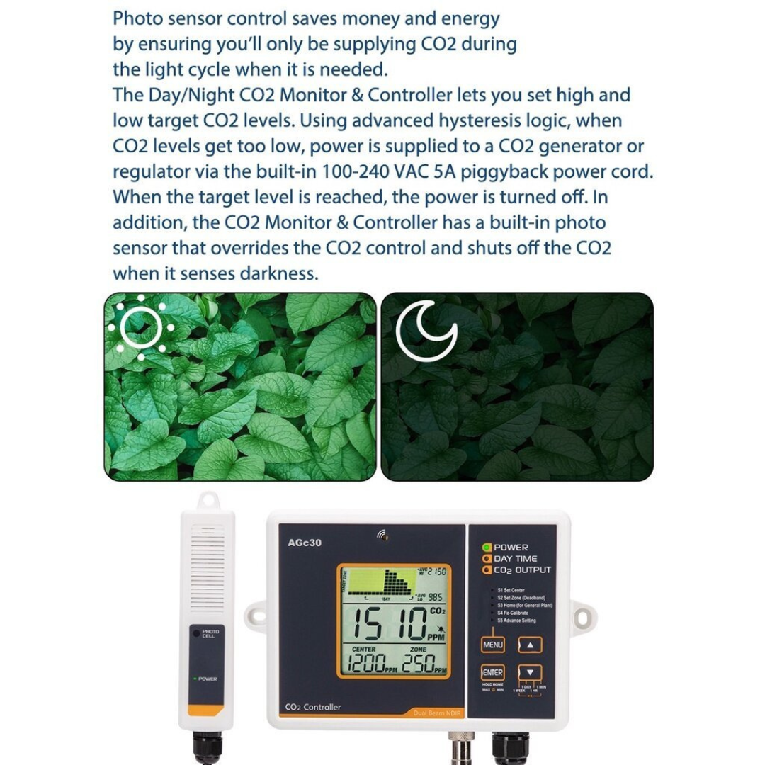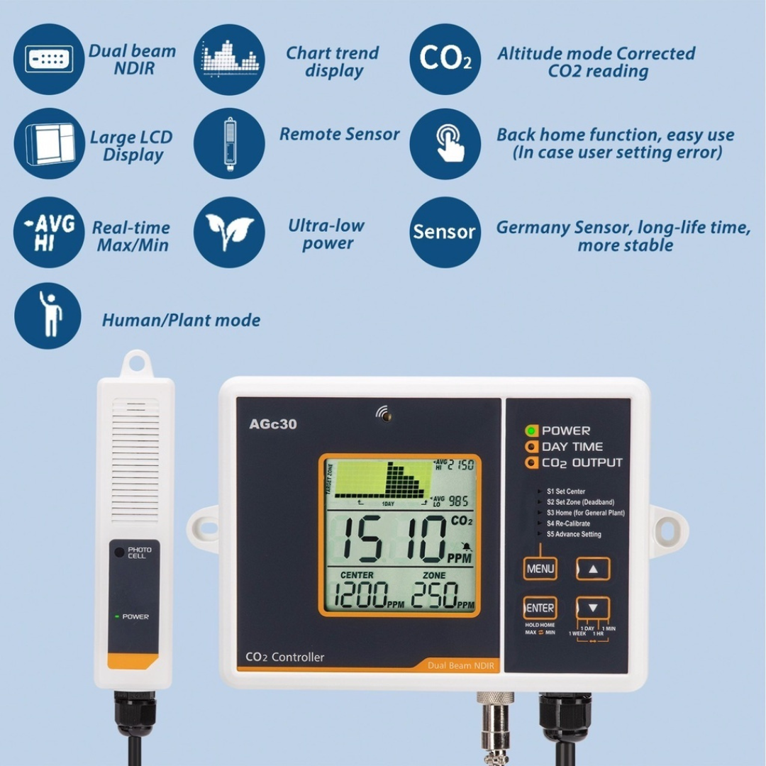 เครื่องควบคุม Co2 แบบติดผนัง AGc30 มาพร้อมเทคโนโลยี Dual Beam NDIR และเซ็นเซอร์ตรวจจับอัตโนมัติสำหรับกลางวัน/กลางคืน ได้รับการออกแบบมาเป็นพิเศษเพื่อวัดระดับ CO2 เชื่อมต่อกับอุปกรณ์อื่นได้ เช่น ถังปล่อย Co2 พร้อมสายวัดความยาว 4.5 เมตร สามารถเชื่อต่อได