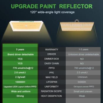 - พลัง : 300W - ครอบคลุมพื้นที่ : 120x120 cm. - PPE : 2.1-2.35umol/j - ปริมาณผลผลิตต่อวัตต์ : 1.5-2 กรัม/วัตต์