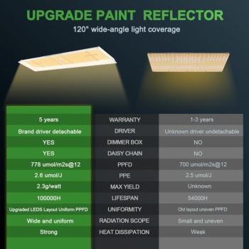 - พลัง : 300W - ครอบคลุมพื้นที่ : 150x90 cm. - PPE : 2.1-2.35umol/j - ปริมาณผลผลิตต่อวัตต์ : 1.5-2 กรัม/วัตต์