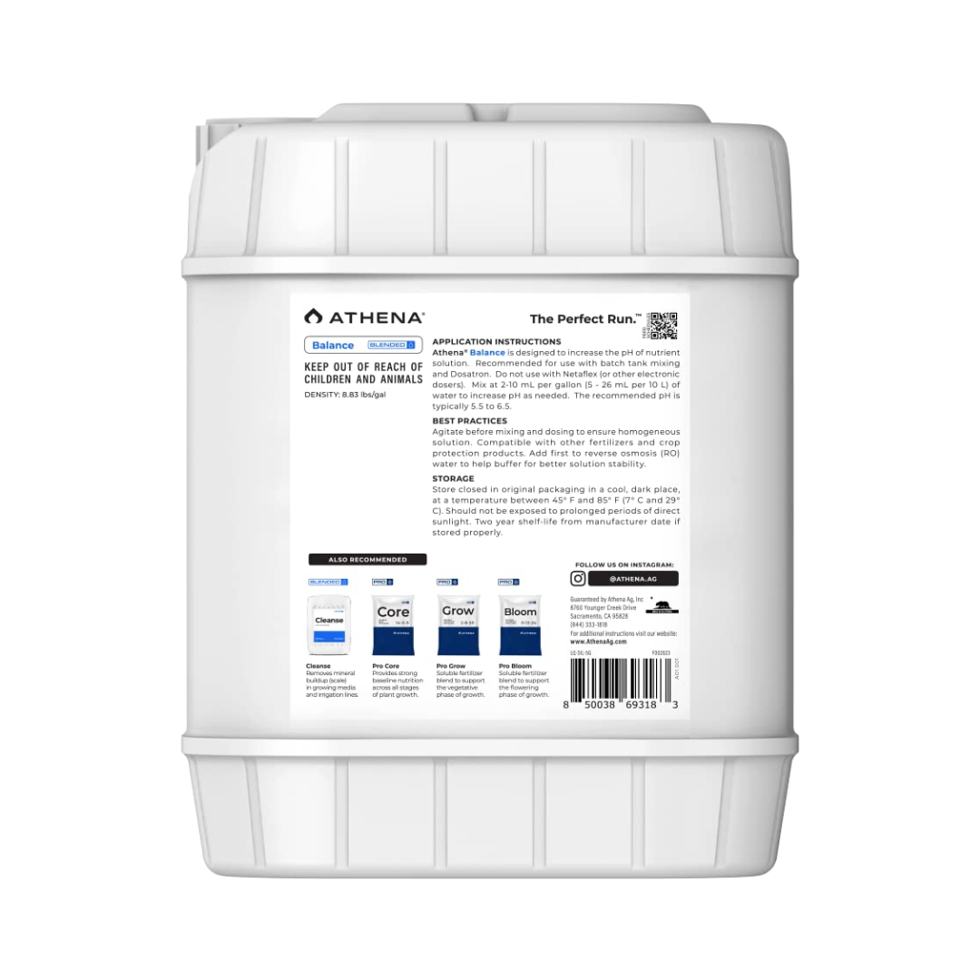หมายเหตุ: Athena Balance จะเพิ่ม pH ของสารละลายของคุณ การใช้งานเป็นประจำ เติม 2-5 มล. ต่อแกลลอนลงในอ่างเก็บน้ำก่อนนำไปผสมกับปุ๋ยและสารเติมแต่งอื่นๆ สำหรับการปรับ pH ผสมปุ๋ยผสมที่มีความแข็งแรงตามปกติของคุณ เพิ่ม Athena Balance เพื่อให้บรรลุค่า pH เป้าหมายของคุณ วัดค่าได้อย่างแน่นอนต่อแกลลอน สำหรับส่วนผสมในอนาคตให้เพิ่มจำนวนนั้น แนวทางปฏิบัติที่ดีที่สุด เขย่าขวดก่อนใช้ ใช้เครื่องมือวัดที่สะอาดอย่าใส่อะไรลงในขวด