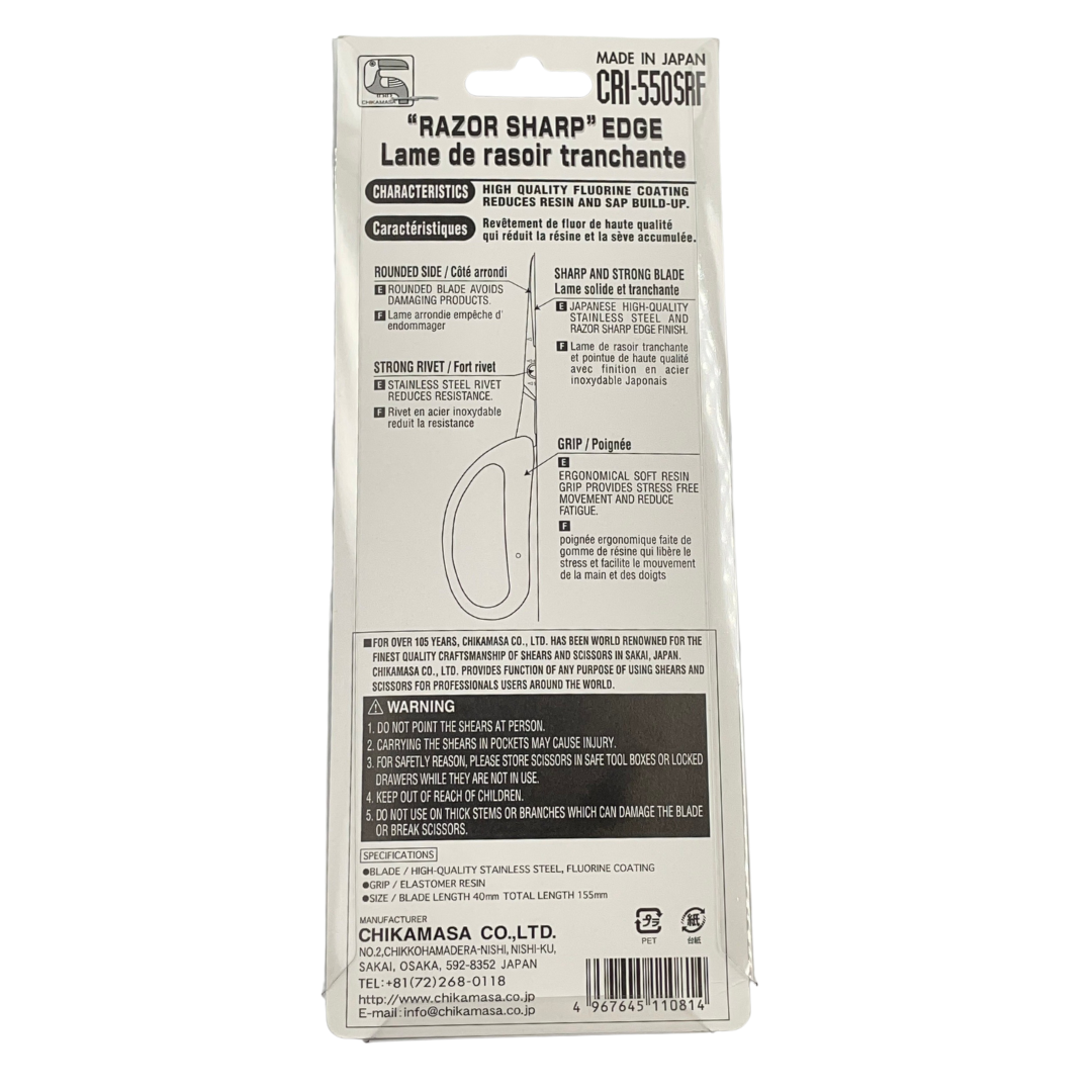 กรรไกร Chikamasa ถูกสร้างขึ้นอย่างพิถีพิถันโดยใช้ใบมีดสแตนเลสคุณภาพสูงที่เคลือบฟลูออรีนเพื่อป้องกันน้ำยาง ตัดแต่งให้ยาวขึ้น เร็วขึ้น และแม่นยำยิ่งขึ้น! ด้วยงานฝีมือที่มีชื่อยาวนานกว่า 100 ปี กรรไกร Chikamasa ผลิตในประเทศญี่ปุ่น